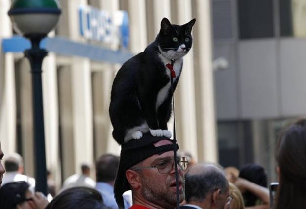 Man with cat on head walks past 71 Broadway where Dominique